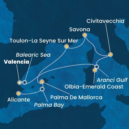 - Valencia->Olbia (Szardínia)->Civitavecchia (Róma)->Savona->La Seyne-Sur-Mer (Toulon)->Palma De Mallorca->Alicante