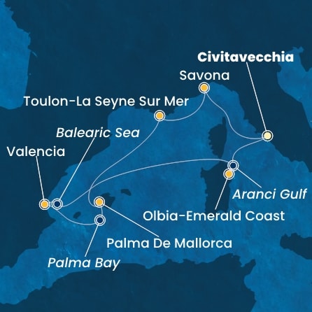 - Civitavecchia (Róma)->Savona->La Seyne-Sur-Mer (Toulon)->Palma De Mallorca->Valencia->Olbia (Szardínia)->Civitavecchia (Róma)
