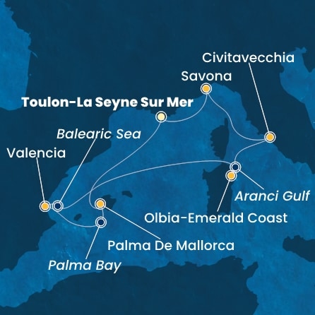 - La Seyne-Sur-Mer (Toulon)->Palma De Mallorca->Valencia->Olbia (Szardínia)->Civitavecchia (Róma)->Savona->La Seyne-Sur-Mer (Toulon)