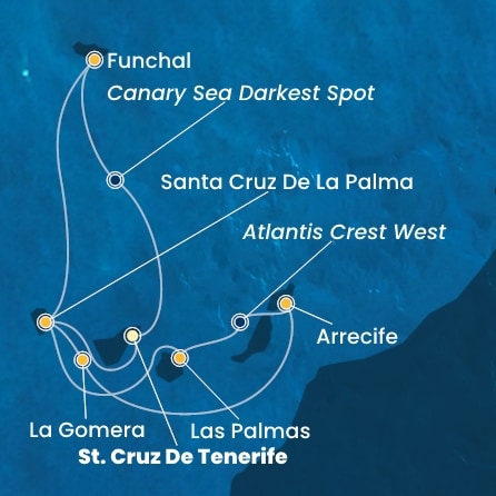 - Santa Cruz (Tenerife)->SPC->GOM->Arrecife (Lanzarote)->Las Palmas (Gran Canaria)->SPC->Funchal (Madeira)->Santa Cruz (Tenerife)