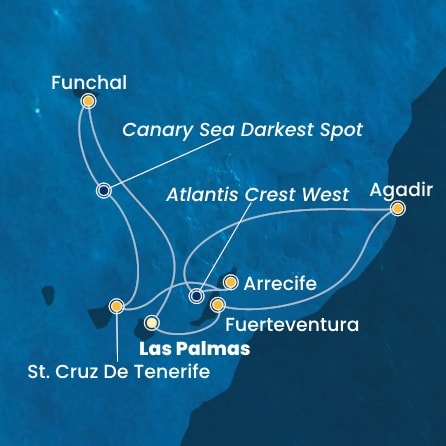 - Las Palmas (Gran Canaria)->Funchal (Madeira)->Santa Cruz (Tenerife)->Arrecife (Lanzarote)->AGA->Fuerteventura->Las Palmas (Gran Canaria)