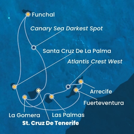 - Santa Cruz (Tenerife)->GOM->Fuerteventura->Arrecife (Lanzarote)->Las Palmas (Gran Canaria)->SPC->Funchal (Madeira)->Santa Cruz (Tenerife)