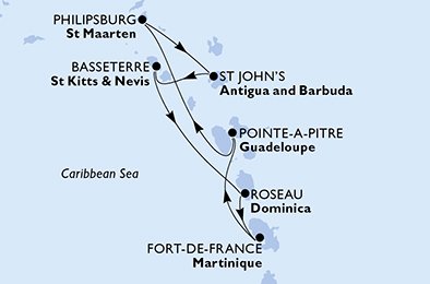 - Fort-de-France -> Pointe-a-Pitre Guadeloupe -> Philipsburg St. Maarten -> At Sea -> St. John's Antigua and Barbuda -> Basseterre St Kitts & Nevis -> Roseau Dominica -> Fort de France Martinique