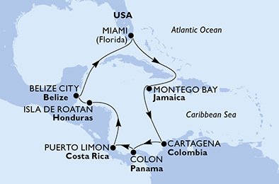 - Miami -> tengeren -> Montego Bay Jamaica -> tengeren -> Cartagena Colombia -> Colon Panama -> Puerto Limon Costa Rica -> tengeren -> Isla de Roatan Honduras -> Belize City Belize -> tengeren -> Miami United States